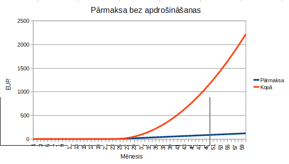 Lai noslēgtu šādu apdrošinājuma līgumu (apdrošinātu EURIBOR 2% līmenī, ir jāsamaksā 4.3% atlikušās kredīta vērtības. Mūsu gadījumā tie būtu 2600EUR. Šo summu var vai nu iemaksāt skaidrā naudā, vai pievienot kredīta kopsummai. Skaidrs, ka otrais variants jau pēc noklusēšanas ir mazāk izdevīgs, jo tas paredz to, ka 2600EUR vietā tu reāli laika gaitā bankai atmaksāsi divas vai trīs reizes lielāku summu. Bet jautājums ir tāds - cik reāli ir tas, ka tu šādā veidā kaut ko ietaupi?