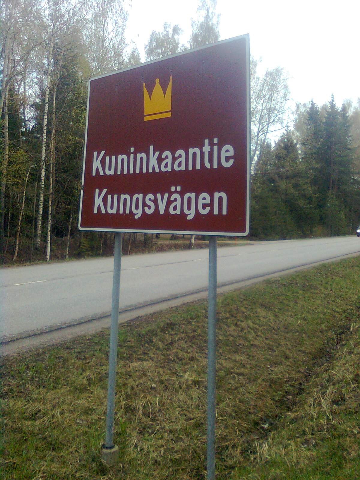 Veiksmīgi (bez nočakarēšanās) izbraucu no Helsinkiem, atkal mazliet pabraucu pa ceļu nr.140 (kas mani iepriekš aizveda uz Lahti), ieraudzīju brūno zīmi ar kronīti (tās apzīmē Karaļa ceļu) un griezos tik nost no šosejas. Pēc brīža bija arī šāda zīmē, kas apstiprināja, ka esmu uz īstā ceļa.