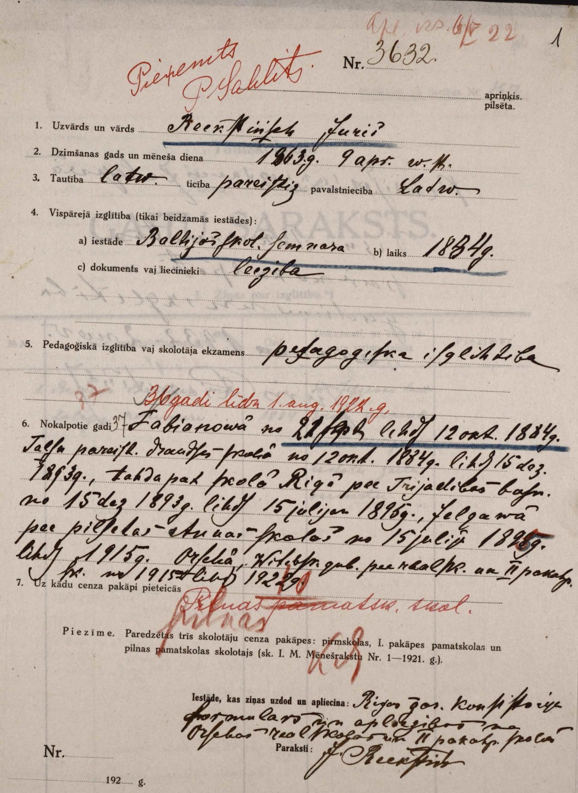 На днях получил письмо от Маруси, в котором она просит меня представить Вам некоторые из своих вещей, оставшихся в Митаве. С удовольствием исполняю ее просьбу и посылаю Вам доверенность на получение вещей, оставленных в 1915-ом году на Добленской улице в бывшем православном приходском училище. Тут перечисляю главные вещи: рояль, мягкая мебель, 8 стульев, диван, шкафы ясеневый и сосновый, 2 этажерки, 2 зеркала - трюмо и туалетное, 2 комода - ясеневый и березовый, столы - столовой ясеневый, кабинетный - ясеневый, кухонные - дубовый и сосновый, стулья - 6 венских и 4 с мягким сидением (бабушкины), 3 кровати - 2 березовых полированных, 1 ясеневая, книги и ноты, часы столовые с медными гирями и будильник. Умывальник (шкафчик) и 2 эмальированых таза и такие же 2 кувшина, 3 маленьких столика - 2 круглых, 1 шестиугольный, буфет ясеневый, ширмы ясеневые полированные, малахитный ящик, (nevaru salasīt) и занавески. Самовары - большой и малый (медные), кофейник медный. Лампы - гостиная с специальным матамическим столиком, столовая высокая, две кабинетных, большая настольная. Кухонная посуда, швейная машинка (ручная), 2 ванны и прочее. Подтвердить, что я там жил в 15ом году, могут Гудже, Дункер, Каде, а лучше всего мой племянник Родион Рекстынь, который недавно вернулся на родину из Сибири и может быть поселится в Митаве (он жил вместе со мной, или вернее - я у него).