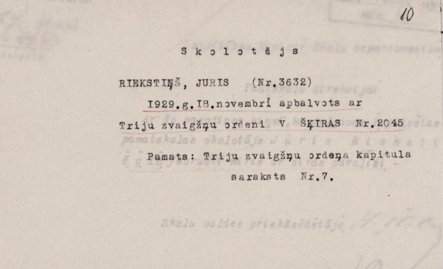 Zīmīgs fakts - 1929. gadā Juris Riekstiņš apbalvots ar 5. šķiras Triju zvaigžnu ordeni (Nr. 2045), domājams, par saviem ilgajiem gadiem pedagoga darbā (tobrīd viņa skolotāja stāžs jau bija virs 40 gadiem). Kārtības labad gan jāpiebilst - nezinu, kā tas bija citus gadus, bet 1929. gadā Triju zvaigžņu ordeņa apbalvoto skolotāju saraksts bija ļoti garš, it īpaši - piektās (zemākās) šķiras ordenim. Tomēr atzinība paliek atzinība.