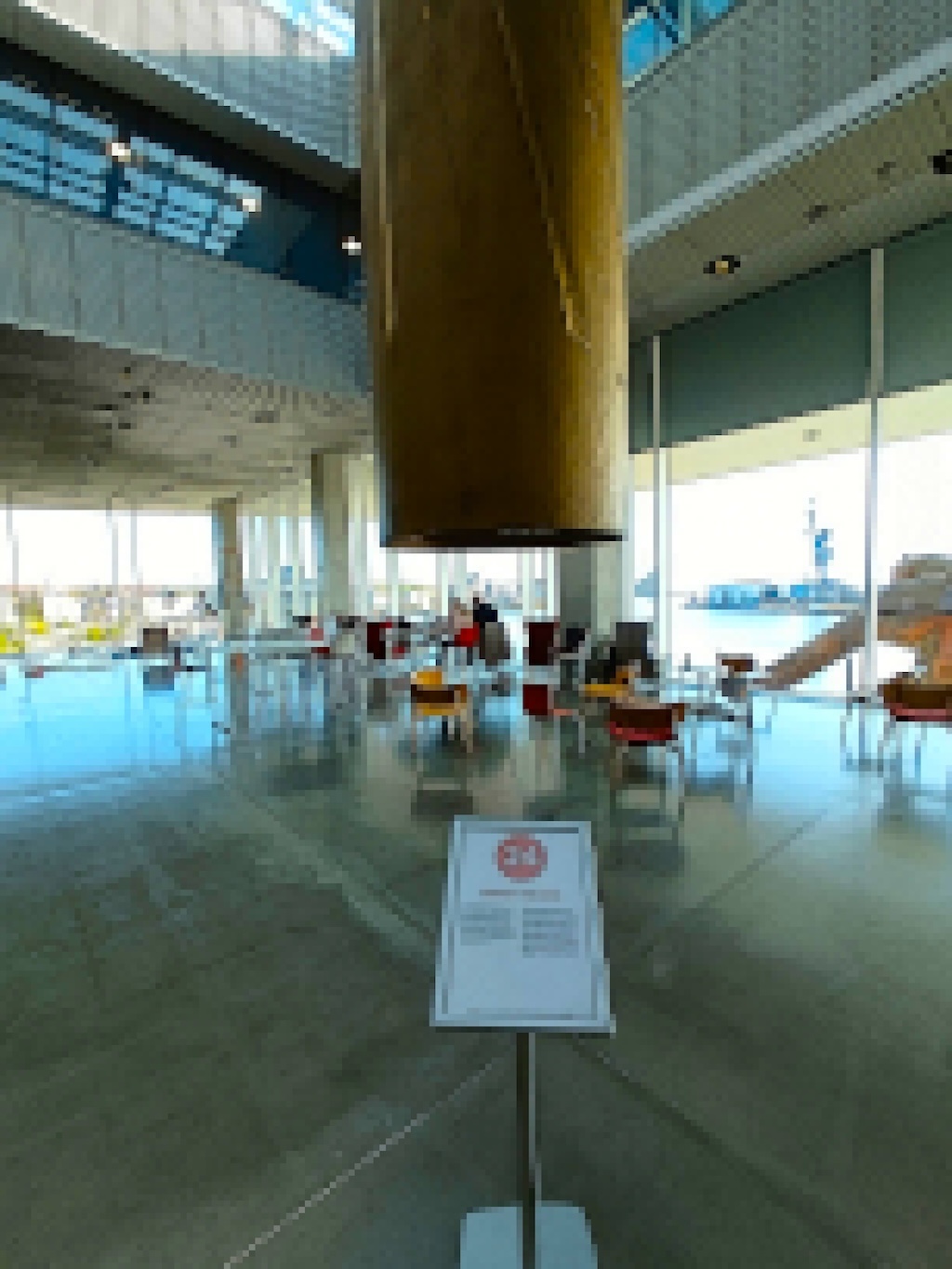Jā, un vēl viens stilīgs elements, kuru gan vairāk novērtējām teorijā: bibliotēkā ir septiņus metrus augsts caurules tipa zvans, kurš ir savienots ar Orhūsas slimnīcu un kuru var iedarbināt no slimnīcas jaunie vecāki, lai vēstītu par bērna ienākšanu savā ģimenē.