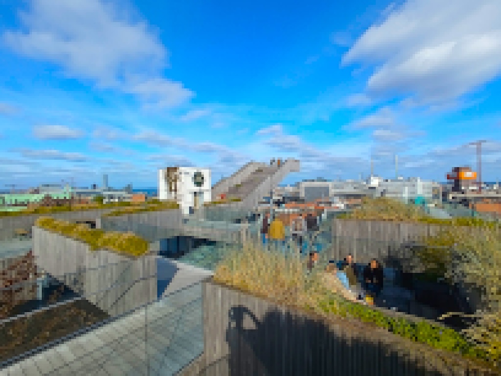 Ja vēlies apskatīties uz pilsētu no augšas, bet negribi maksāt par ARoS apmeklējumu, vari doties uz kāda lielveikala jumtu, kur ir izbūvēts riktīgi stilīgs vairāklīmeņu dārzs ar kafejnīcām, visādiem zaļumiem, atpūtas vietām un stikla platformu, kas karājas pāri centrālajai Orhūsas iepirkšanās ielai. Rekomendēju!