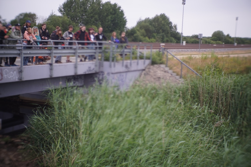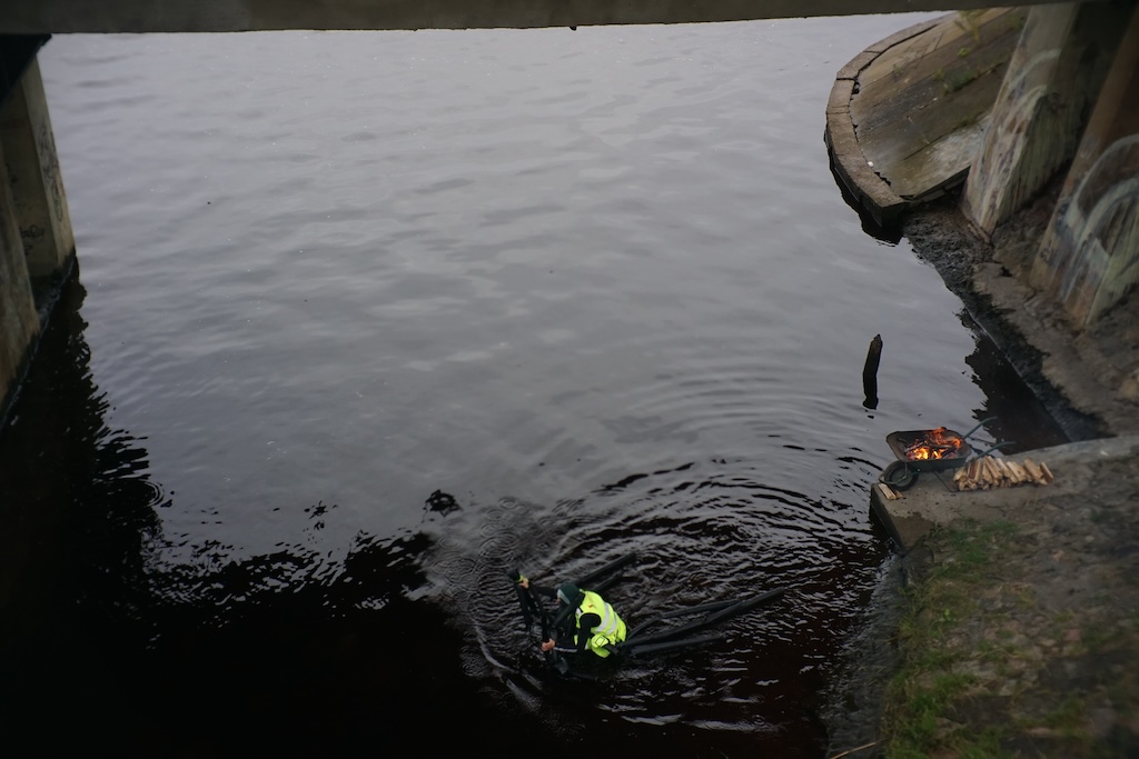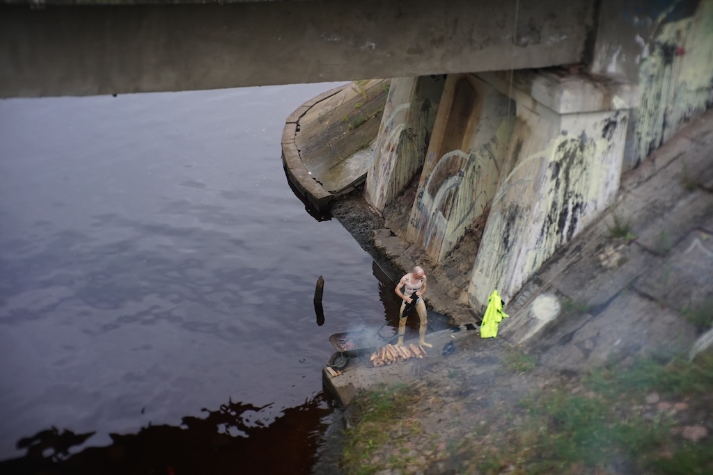 Nākamais punkts vietā, ko sauc Starpparalēļu kanjons. Tilts pāri Buļļupei. Vienā pusē Bolderāja, otrā Daugavgrīva. Es gan tāpat lielākoties jaucu. "Slekkeworld" ar performanci "Unburnt bridge". Dzelzceļa tiltu patiešām nenodedzināja. Bet tālu no tā nebija. Vīrs maskā ar cirvi. Ugunskurs ķerrā. Malkas skaldīšana. Pārdomas par to, ka varētu labāk. Varbūt ne gluži es, bet tomēr. Malkas ciršana nav viņa maizes darbs. Bet kaut kas ar "The Lumberjack Song" kopīgs bija. Tas gan atklājās vēlāk. Vispirms viņš pārtapa par Zirnekļcilvēku. Vai kaut ko tam līdzīgu. Tad - izpeldējās upē. Tad izģērbās. Līdz apakšbiksēm un tīkliņzeķubiksēm.