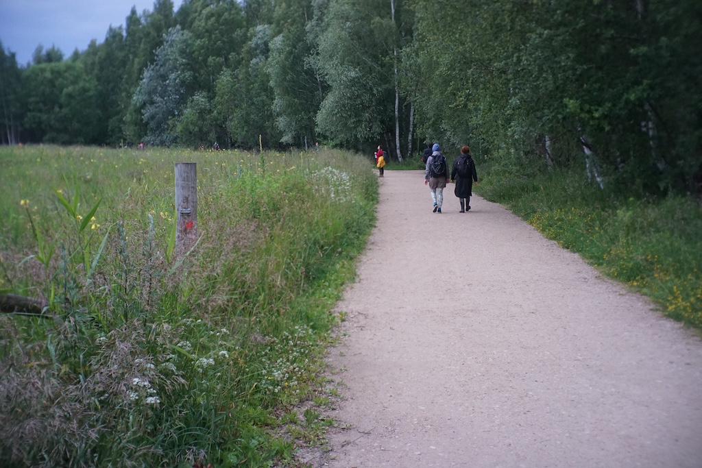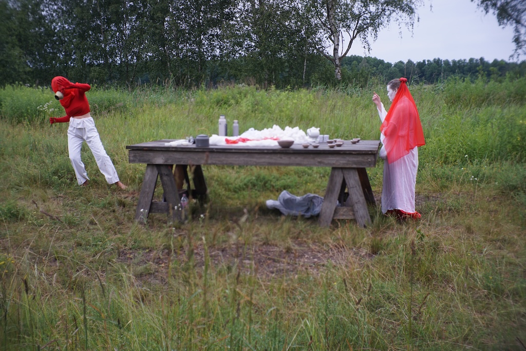 Tad arī mums nāca laiks slapināties. Šoreiz - arī no lejas. Pa laipām, pa pļavām, gar padomju armijas atliekām. Es gan biju gaidījis slapjāku. Kad kājās sandales, nav jāsūkstās. Arī, ja kājās zandales. Bet, ja gumijnieki - tad varbūt esi Platons. Uz pļavu, kur "Butō lab" nodrošināja tējas ceremoniju. Tās vārds bija "Vasaras guļamistaba". Guļamistabas logam vajadzētu odu tīklu priekšā. Līdzīgi kā "Dažreiz traks Dievs", tikai sarkani. Kā vienkārša sieviete, tikai balta. Prasījās pēc pufiem. Šādu mākslu labāk baudīt sēdus. Deva tēju, bet mana garšīgāka. Tiesa, tā gāja uz beigām.